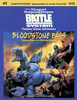 For a while in my early teens, I used Battle System often and had a lot of fun with it. Though my affection for it eventually waned, that wasn't before I had the chance to make use of the first module published to support it, Bloodstone Pass. Written by Douglas Niles and Michael Dobson, module H1 is called a "supermodule" and intended for use with characters of level 15 and above. I presume it was called a supermodule because it came in a thin box and was filled with more than 100 cardboard counters and a dozen fold-up buildings, in addition to the expected 32-page scenario (and Battle System unit roster book). It's a fairly impressive package overall, since it provides the referee with everything he needs to run not just the adventure itself but all the mass battles that occur during its events.