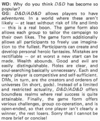 Livingstone then asks Gygax about the appeal of D&D and the kinds of people who enjoy playing it. What Gygax says is quite interesting, some of it echoing things he'd said elsewhere. He starts by describing the qualities of a "good D&D player" as follows: