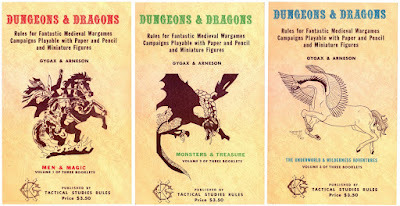 Most of us, after all, are raised on fairy tales, fantasy, and myth. With that background, I actually don't view fantasy gaming as a novel idea, really, and I marvel that it wasn't done before D&D!Of course, as Gygax already admitted, it was done before D&D, by Arneson and his crew in the Twin Cities. There are also other examples of proto-FRPGs prior to 1974, such as the Lankhmar games Fritz Leiber played with Harry Fischer, but none of them, including Blackmoor, saw print until after TSR published OD&D. (As an aside, Gygax implies that Guidon Games might have published it, if it had not folded beforehand and Avalon Hill was "luke warm to suggestions about fantasy.")