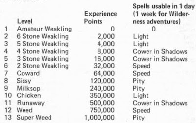 "Treasure Chest" presents three more monsters (which were originally submitted to "Fiend Factory," according to the column's introduction), a magic item, and a humorous class called the Weakling. Here's its advancement table: