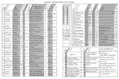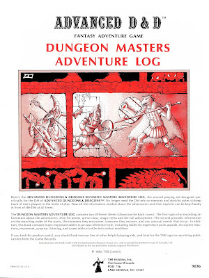 Consequently, I was a ready mark for gaming accessories like TSR's Dungeon Masters Adventure Log. Appearing in 1980, it boasts of being "the second playing aid designed specifically for the DM of ADVANCED DUNGEONS & DRAGONS™!" (the first presumably being the AD&D Dungeon Masters Screen). Further, the Adventure Log claims to free the referee from having to "rely on memory and sketchy notes to keep track of one's players in the midst of play." Nowadays, I wouldn't see much point in such a product, but, at the time, it appealed precisely to that part of me that thought the Trapper Keeper was the height of technological progress.