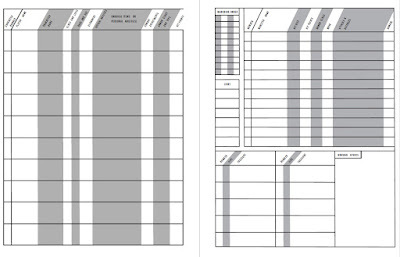 The Log is quite a simple product. After a few pages of reproducing various AD&D rules charts, ranging from the genuinely useful (like AC modifiers and XP tables) to the downright esoteric (magical aging causes), the meat of the product consists of a series of two-page spreads that look like this: