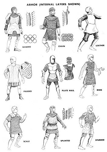 Despite the relative weakness of its design (and limitations of its layout), there are nevertheless three things that stand out a noteworthy about the Dungeon Masters Adventure Log. The first is the terrific cover illustration illustration by Erol Otus. The second is a four-page centerfold that provides illustrations of many common pieces of AD&D armor and weaponry. Here's a page to give you an idea of what it all looked like: