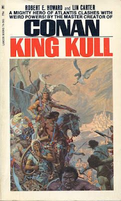 The relative obscurity of Kull, at least in popular culture, can to some extent be ascribed to the fact that only three of Howard's stories of him were published during his lifetime. The other were largely unknown until the 1967, when Lancer published King Kull. As you can see from the cover accompanying this post, the book's editor, Lin Carter, shares authorship with Robert E. Howard, thanks to Carter's having "completed" three fragmentary stories originally penned by Howard in the 1930s. Like most so-called "posthumous collaborations," I don't think much of Carter's efforts, but there's no question that King Kull was an important publication for appreciating Howard's broader literary legacy. If nothing else, it gave fantasy fans a fuller picture of Kull and his world so as to distinguish them from Conan and the Hyborian Age.