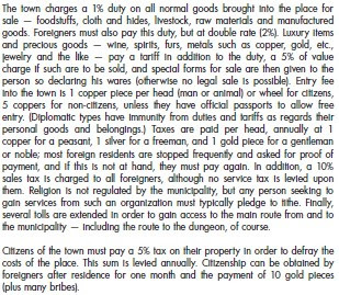 The form and frequency of taxation depends upon the locale and the social structure. Duties are typically paid on goods brought into a country or subdivision thereof, so any furs, tapestries, etc. brought into a town for sale will probably be subject to duty. Excises are typically sums paid to belong to a particular profession or practice a certain calling; in addition, an excise can be levied against a foreign currency, for example, in order to change it into the less remarkable coin of the realm …