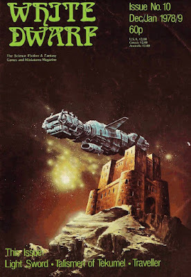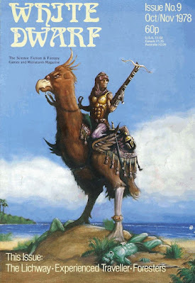 Issue #10 of White Dwarf (December 1978/January 1979) features a striking cover by Eddie Jones. It's the kind of funky blend of science fiction and fantasy I so strongly associate with the 1970s and that remains a fascination of mine. Ian Livingstone's editorial focuses only fairly mundane matters, such as the attendance figures of the Games Day IV convention and the release of the AD&D Players Handbook. The magazine will return to both these topics later.