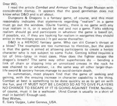 The issue ends with "Thoughts on the Proliferation of Magic Items in D&D" by none other than Gary Gygax. As one might expect, Gygax is very much opposed to what he calls "magic on the cheap," something he claims is quite common in "hobby publications" at the time. He suggests that, since D&D is "designed for a long period of active play," the referee would be wise to give out magic items sparingly and with an eye toward ensuring that the game remain challenging over time. He then offers many strategies for separating PCs from magic treasure so as to maintain the appropriate balance. Everything he says here comports with his writings on the subject elsewhere, but, as I commented earlier, his tone is condescendingly off-putting at times and I fear it might sometimes get in the way of what he intends to say (Physician, heal thyself).