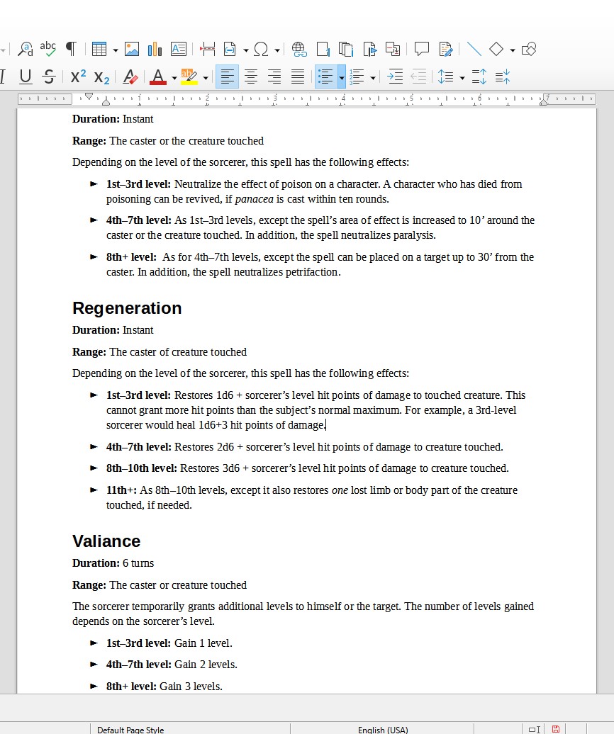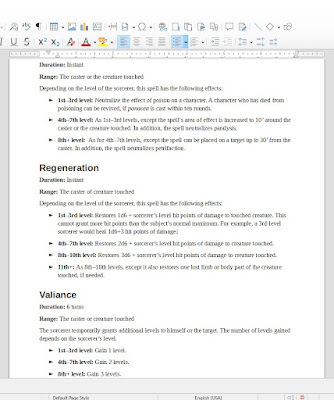 I spent the weekend hard at work on detailing sorcerer spells for my upcoming The Vaults of sha-Arthan campaign. As you can see, spells aren't leveled in the same way they are in traditional Dungeons & Dragons. Instead, I've decided to make all spells available to all sorcerers, regardless of level. However, the sorcerer's level determines the effect of the spell, with some spells offering much more impressive effects when cast by high-level sorcerers. The document is still in draft form and will probably not see a truly final version until I've had the chance to test it in the campaign (which I hope will begin next month sometime). For now, I'm simply plowing ahead, hoping to get it to done so I can add it to the growing sha-Arthan Player's Guide.