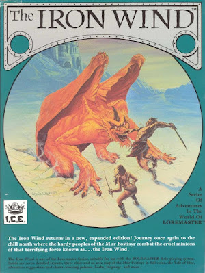 A good example of this is The Iron Wind, whose second edition was published in 1984 (its first edition appeared in 1980 and predates the existence of Rolemaster, but I have never seen it in the wild). The subtitle of the book is "a series of adventures in the world of Loremaster," but that's not truly accurate. Yes, The Iron Wind does include some scenario outlines within its 50 pages, but those are brief and take up less than a single page. Instead, the bulk of the book is devoted to an overview of the Mur Fostisyr, an island cluster northwest of the setting's main continent of Jaiman.