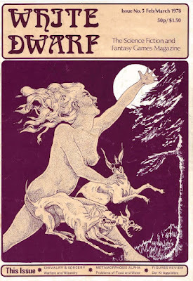 "Food and Water on the Starship Warden" by Richard Edwards is an article supporting TSR's Metamorphosis Alpha. It's a decent article, providing lots of ideas (and examples) for the referee to use in establishing the ecology of the starship, as well as how to make use of it in his campaign. I continue to be struck by the presence of MA articles in White Dwarf. It's a game I knew so little about in my youth and yet, from the looks of things, it seems to have been quite popular in its time. The first installment of a fantasy comic called "Kalgar" appears in this issue, written and drawn by David Lloyd. Rounding out the issue are three new magic items by Joseph Nicholas and Brian Asbury's new experience point system. The system, which he facetiously dubs "the Asbury System" is based on hit points of the creatures defeated, not hit dice. This enables him to dole out XP to characters based on the amount of damage they do to an opponent. I can see some value in this sort of approach, but, as with most of Brian Asbury's articles in WD, the new rules seem more complex than they ought to be.