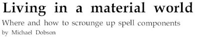 As to the content of the article itself, I can't deny that it's rather well done. Dobson is to be admired for his intestinal fortitude in providing a comprehensive accounting of all of AD&D's material spell components, including their costs, where they might be obtained, and their rarity. He then uses this information to provide the referee with the likelihood that various locales might have the components for which one is searching. There's a base chance, modified by rarity, the size of the locale in which one is searching, and other factors. It's actually a fairly easy system to use if you have the article handy, but one wonders why anyone would bother – at least I do (and did).