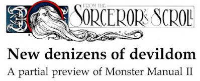 Issue #75 is probably best remembered for the first part of Ed Greenwood's superb treatment of the Nine Hells and rightly so. What people sometimes forget is that the issue also included a partial preview of the upcoming Monster Manual II in Gary Gygax's regular "From the Sorcerer's Scroll" column. In fact, I believe it was precisely because of the planned appearance of this preview that Greenwood was given the go-ahead – with Gygax's blessing – to develop the Nine Hells as an adventuring locale suitable for use with AD&D.