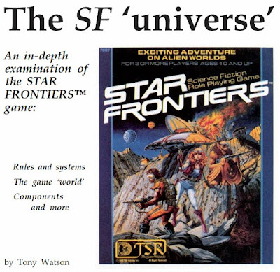 Issue #74 of Dragon (June 1983) included a lengthy article, "The SF 'universe'" by Tony Watson that came to a similar conclusion. Over the course of seven pages, Watson presents an extensive review of the game, examining the setting, artwork, components, rules, and introductory module. The review is quite thorough and, I think, fair. Even though it appeared in the pages of Dragon, TSR's house magazine, Watson's review is not slavish in its praise. If anything, it errs a bit on the side of being occasionally too critical of the game and its decidedly different approach to science fiction than Traveller or Universe, to which Watson frequently compares Star Frontiers and not always positively.Watson's main criticisms of Star Frontiers are that it's strongly combat-focused, lacks starship rules, and that its overall tenor is more like Star Wars than 2001: A Space Odyssey. Of these criticisms, the lack of starship rules largely ceased to be an issue once the Knight Hawks expansion was released (ironically, not long after these article appeared). The other two criticisms are related, in my opinion. As I said earlier, Star Frontiers is more an action-adventure RPG than is Traveller. It's about adventures in space, fighting alien saboteurs and space pirates and surviving on a weird, inhospitable planet and the game's rules and presentation reflect that.