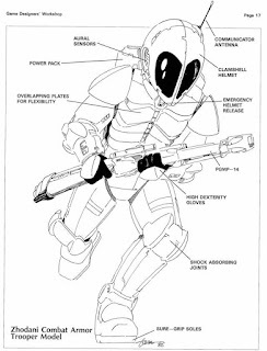 The psionic Zhodani are the main rivals of the Third Imperium and were described in detail in the fourth Alien Module produced for Traveller. One of many great things about that supplement is the way it firmly established the esthetics of the Zhodani Consulate and their citizens and military forces. I particularly like this illustration (by Bryan Gibson) of Zhodani battle dress, complete with notations pointing out its various features, such as its distinctive clamshell helmet. This piece occupies a halfway point between being a traditional illustration and being a diagram, I think, but it's all the more effective for it.