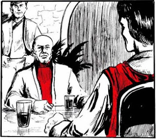 Another William H. Keith piece from The Traveller Book (note the red highlights), it depicts a distinctive element of Traveller – and one about which I'll be posting soon – the patron encounter. Many a Traveller adventure begins with meeting Space Sydney Greenstreet over drinks in the darkened corner of a startown bar, his bodyguard looming over the proceedings. Ironically, it's not a scene about which I can recall many illustrations in GDW products, which is probably why this one has stuck with me over the years. In many ways, this is the defining image of Traveller, or at least the way it was played back in my youth. If I didn't have other even more representative images, I'd probably rate this one even higher.