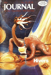 The Journal of the Travellers' Aid Society was GDW's in-house periodical for supporting Traveller (until it was replaced by Challenge in 1986). With a few exceptions, the covers of JTAS weren't notable, but issue #13 is one that really captured my imagination. Drawn by William H. Keith, it depicts a member of the Hiver species, one of the most interesting – and weird – nonhuman aliens of the official Third Imperium setting. Few of the subsequent depictions of the Hivers ever looked as good as this one in my opinion, not even those in the Alien Module devoted to them. Consequently, this particular piece has stuck with me for years as a high point in Traveller art, particularly of alien species.