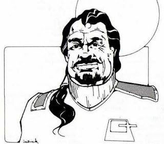 OD&D had Xylarthen the Magic-User and Traveller had Alexander Lascelles Jamison. This 38 year-old merchant captain has been the game's sample character since 1977, but his portrait got a significant upgrade in The Traveller Book over its original version. Drawn by David Dietrick, who provided a lot of great artwork for Traveller during the mid to late 1980s (and in Thousand Suns , too, come to think of it). Dietrick's reimagining of Jamison isn't just how I imagine this particular character; he's my mental image of the default Traveller character. You can't get much more iconic than that.