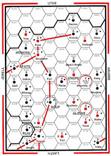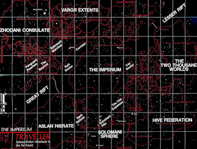 If D&D is defined in part by graph paper, Traveller is defined by hex paper, or rather by its 8×10 hex-based subsector maps, the foundations upon which the game's conception of the galaxy are built. Regina subsector is subsector C of the Spinward Marches and the example subector presented in in many GDW products. Regina is thus like the Grand Duchy of Karameikos, the Dalelands, or Lakefront City – an example that grows beyond its original purpose to have a life of its own. Every time I look at this map, I quickly find myself imagining situations and adventures on its worlds, especially those located outside the main travel routes. Looking at this map makes me want to play Traveller, which is exactly what a good RPG image should do.