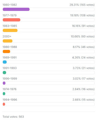 With two more polls closed, let's take a look at the results, starting with when were you first introduced to roleplaying games? When I posted this poll on March 3, my initial guess was that most of my regular readers were introduced to tabletop RPGs sometime between 1979 and 1983. As you can see, my prediction was very close to the truth.