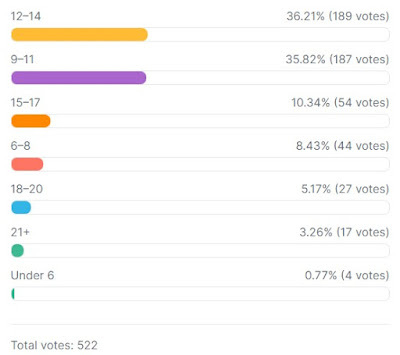 The next poll, which originally appeared on March 10, asked: how old were you when you first started playing tabletop RPGs? My prediction was that the winning answer would be somewhere in the 10 to 14 age range – and I was correct.