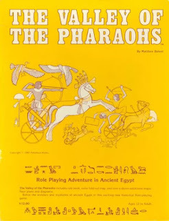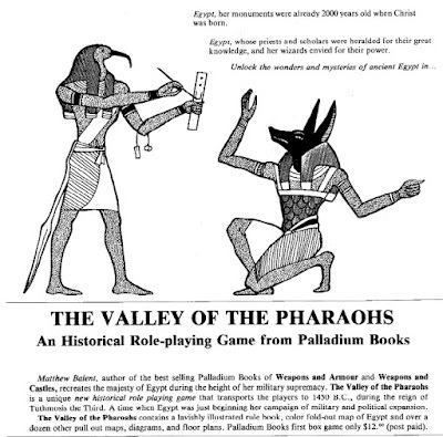 I've said before that I have very little direct experience with Palladium Books or its roleplaying games. With the exception of my old college roommate, I never knew anyone who played any of their games, despite the fact that there seem to be a huge number of them. Even so, I was aware of the existence of Palladium and its products through the advertisements that regularly appeared in the pages of Dragon. One that particularly fascinated me was The Valley of the Pharaohs, which first appeared in 1983. Recently, a friend of mine pointed out to me that the game was available as an inexpensive PDF from DriveThruRPG, so I grabbed a copy and finally had a chance to look at it after all these years.