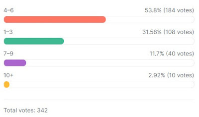 The first three polls are now closed and I'd like to share the results. The first poll was How many people – players + referee(s) – were there in your gaming group at the time you first started roleplaying? yielded the following, based on 342 votes: