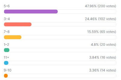 The second poll was How many people – players + referee(s) – are in your gaming group at present? and yielded results consonant with the first one, based on 417 votes: