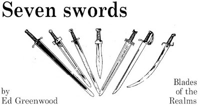 What "Seven Swords" does is present seven different magical weapons, none of which is more potent than a sword +3. Each of these swords gets an extensive description of both its physical and magical properties. Amusingly, it's often the physical description that really sets these swords apart from the pack. Whether it's the huge cabochon-cut black sapphire in the grip of Adjatha, the six matched bloodstones set in the bronze blade of Ilbratha, or the rearing serpents who make the guard of Shazzellim, Greenwood makes each of these weapons unique in appearance as well as abilities. This is a small detail that many referees overlook, concentrating instead on game mechanical effects. Greenwood doesn't skimp on these either, but they're only one facet of what makes the titular swords special.