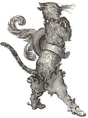 As they made their way to Shagsend, the characters encountered a grimalkin mounted on a seelie dog. Sophisticated and elegant, he introduced himself as Marid Adventi, an enchanter traveling to Shagsend in the company of the Demoiselle Madrigal de Chanterelle, a fairy fungus cat. Marid is a new player character, so this was an opportunity to introduce him into the campaign, bringing the total characters to four. I was especially happy in this case, as his player is an old friend with whom we hadn't gamed for many years. His return to the fold was thus a moment for rejoicing.