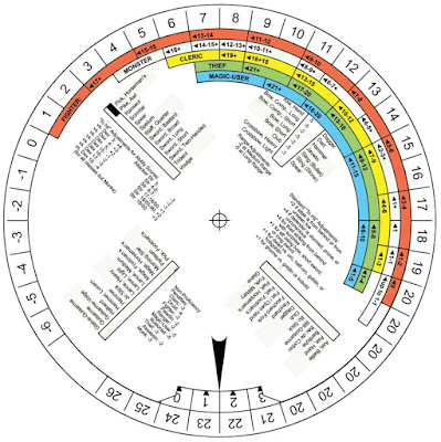 Perhaps the most memorable example of this occurred in issue #74 (June 1983), which included "The Dragon Magazine Combat Computer," designed by Laura and Tracy Hickman and brought to life by Roger Raupp. The titular Combat Computer is a pair of cardboard discs that, after being cut out, can be placed one on top of the other and connected with a brass paper fastener. When assembled, the topmost disc (the plate) can spin atop the lower disc (the base). Doing so enables the user to calculate the number needed to hit for any AD&D character of any class or level against any armor class. The Combat Computer even aids the user in making use of "weapon vs AC" adjustments that most people in my experience generally ignored.