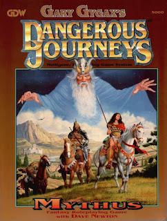 "Infinite Adventures" was never published and I have no idea whether any work was even devoted to its design. However, just a few years later, in 1992, Game Designers' Workshop released Mythus, the first book of a multi-genre roleplaying system written by Gygax, with the assistance of Dave Newton, a name otherwise unknown to me. That multi-genre system was initially announced as Dangerous Dimensions, but TSR threatened a lawsuit, because of a supposed similarity between the initials – DD – and those of Gygx's more famous game (D&D). To avoid the suit, GDW changed the series title to Dangerous Journeys. Unfortunately, this was not to be the last time TSR would legally interfere with GDW, Gygax, and Dangerous Journeys, as I'll discuss later.