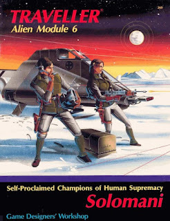 Like all previous Alien Modules, this one provides everything needed to play and use Solomani characters in the Third Imperium setting. There's history, politics, technology, character generation, and even an adventure. Particular attention is given to the Solomani Party and its sinister enforcement arm, Solomani Security (or SolSec). Like the Gestapo or KGB, SolSec serves as both a secret police force and as a hedge against members of the Party failing to toe the official line. The Solomani government is thus set up as antagonistic both to the Imperium and any Solomani within the Confederation who hope to see it reform by moving away from its ideology.