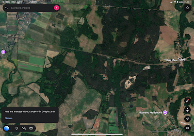I mention this, because, during the course of the Barrett's Raiders campaign, the characters would often find themselves in some hex or other. The players would inevitably have questions about the specific terrain in what looked, on the map, to be a largely empty hex. What was the elevation like? Where there any farmhouses or buildings? What about dirt roads? Etc., etc. Usually, I'd make something up on the spot and that would be that. However, players would sometimes think they could be helpful to me by making use of Google Earth to show us an image of what an area "really" looks like. For example, here's an image of the area above from Google Earth: