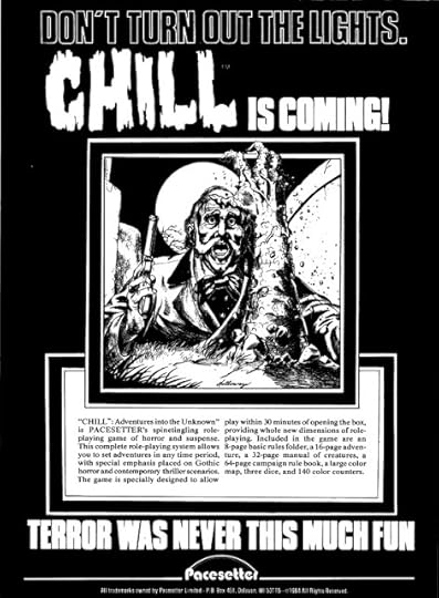 From issue #86 (June 1984) of Dragon comes one of the first advertisements for Pacesetter's horror RPG, Chill, that I ever saw. The accompanying artwork, by the late, great Jim Holloway, is quite effective, though it's a bit unclear where the mutton-chopped fellow is standing. Is he standing in an open grave? If so, where's that sinister hand coming from? If he's not, where are the gentleman's legs? So many questions!