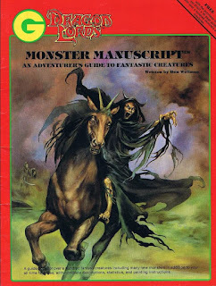 Grenadier, you may recall, once held the license to produce official AD&D miniatures, a license they lost in 1982. In the aftermath of that loss, Grenadier rebranded their fantasy figures under the name Dragon Lords, many of which were identical to their old AD&D sculpts under new names. However, after a few years, the company wanted to create new sculpts of their monsters and, to promote that endeavor, they released the Monster Manuscript, which also became the name of the Dragon Lords sub-line devoted to fantasy creatures. All of the monsters included in the book thus had corresponding figures released for them over the course of 1986 and '87.