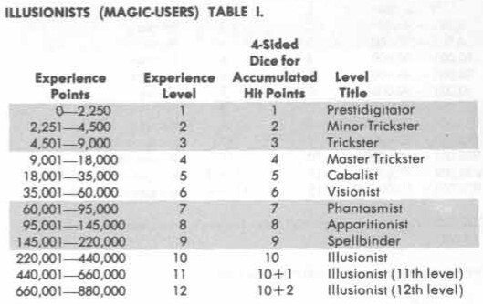 Having already covered the level titles of most of the character classes in Dungeons & Dragons, it's now time to turn to those that remain, some of which are unusual. Let's start with the most straightforward: illusionists. A sub-class of magic-user, illusionists first appeared in volume 1, issue 4 of The Strategic Review (Winter 1975) in an article written by Peter Aronson. As presented there, illusionists have the following level titles: