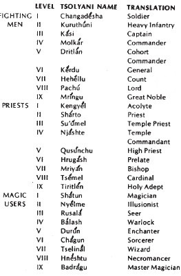Having now covered all of the published TSR era D&D and AD&D character classes with level titles, I wanted to turn to some other RPGs published by the same company that also include them. First up is Empire of the Petal Throne (1975), which only makes sense, as the game's rules were essentially a variant of OD&D. Here is the chart featuring level titles for all three character classes available in that game: