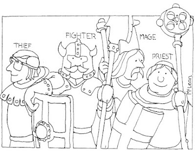 I never owned Wizardry myself. When I played it, I did so on a friend's computer after having watched him play it. Consequently, I don't think I ever saw the game's manual or, if I did, I have no recollection of doing so. That's too bad, because the manual contains notable artwork, like this one, depicting the four basic character classes: