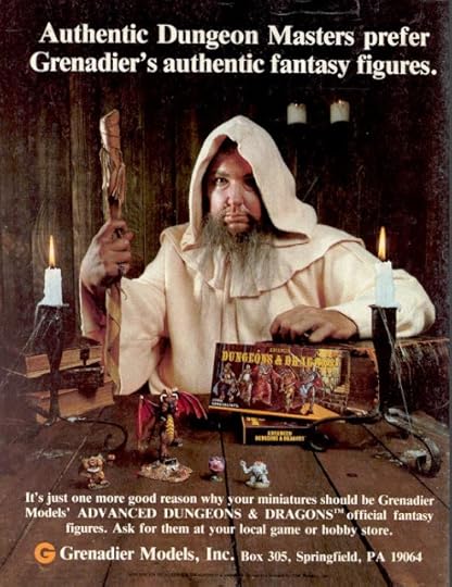 During the period between 1979 and 1982 when Grenadier Models held the license to produce official Advanced Dungeons & Dragons miniatures, the company ran lots of advertisements in the pages of Dragon magazine and elsewhere. Because they frequently made use of people dressed up in fantasy garb, I've always found them quite memorable (and silly – but in a good kind of way). Here's one I came across from issue #61 (May 1982) while preparing my earlier post from today.