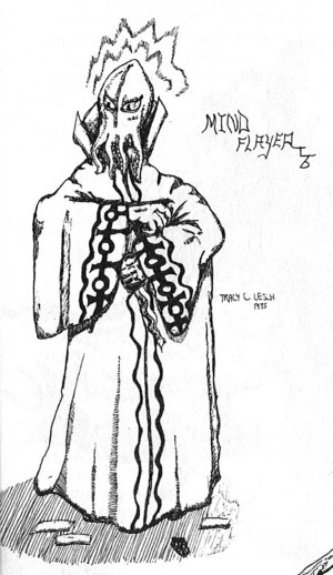 Though the mind flayer first appears in issue #1 of The Strategic Review (Spring 1975), the first illustration of it does not appear until a year later, in Supplement III, Eldritch Wizardry (1976), as drawn by Tracy Lesch. Despite how early it is, this is clearly recognizable as the monster of later depictions – a rare instance when someone other than Dave Sutherland laid the esthetic foundations upon which later artists would build.