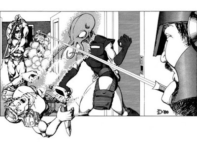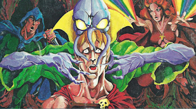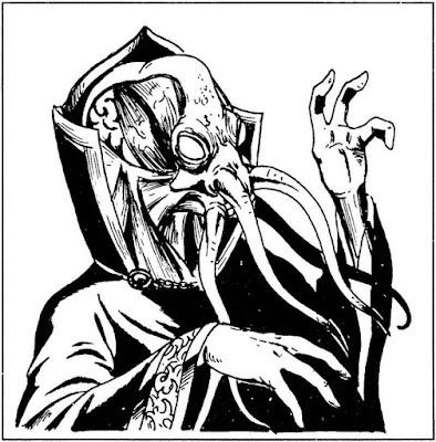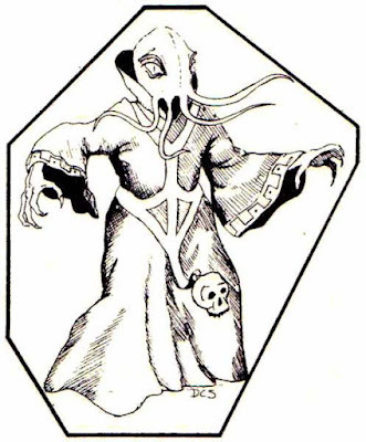 Speaking of Dave Sutherland, here's his take on the mind flayer from the Monster Manual (1977). You can see that he was riffing off Lesch's original conception, right down to having four facial tentacles and a preference for high-collared robes of the sort favored by Ming the Merciless.