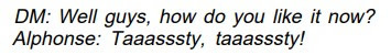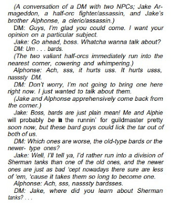 In his article, Goelz proposes to return bards to something closer to what was seen in the Strategic Review, albeit with numerous tweaks of his own. He begins with an amusing exchange between a DM and two half-orc NPCs, in which they discuss bards.