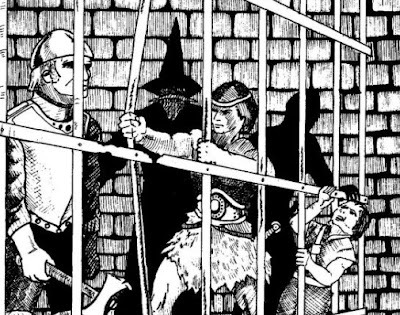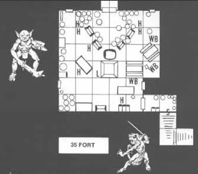 The fort (the titular Slavers' Stockade, which gets an apostrophe in the text but not on the cover) is large and well defended, with plenty of guards whose presence makes it difficult for the characters to move about. In fact, the place is so well defended that the tournament scoring system operates under the assumption that, after three hours of play, the characters will not make it very far into the fort. In addition, there's a section specifically devoted to "hill fort strategy," detailing how the guards will respond once it becomes apparent there are intruders in their midst. That's not even factoring in wandering monsters. In short, the characters have their job cut out for them.