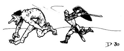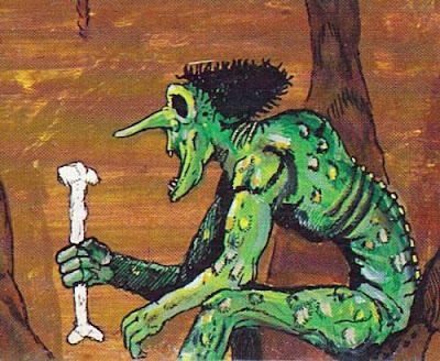 It's well known that, in populating the bestiary of Dungeons & Dragons, Arneson and Gygax regularly looked beyond mythology and folklore for inspiration. Such is obviously the case with the troll, which borrows heavily from the monster's description in Poul Anderson's Three Hearts and Three Lions right down to its green color and ability to regenerate. Unlike many of the other monsters we've looked at in this series, the troll's appearance is remarkably consistent during the TSR era of D&D. Despite the large number of artists who've drawn this horrid creature, nearly all of them seem to be using its initial appearance in 1977's Monster Manual as a guide.