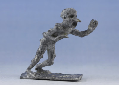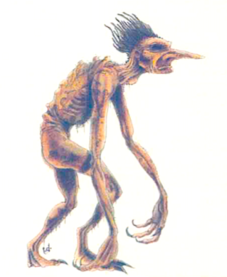 During the same year, Minifigs produced a figure of a troll that looks almost identical to that of Sutherland's illustration (unless the inspiration goes in the other direction). In any case, the troll's primary physical characteristics seem to be its tall, lanky body; tooth-filled mouth, long nose, black, deep-set eyes, and bristly black hair atop its elongated head.