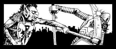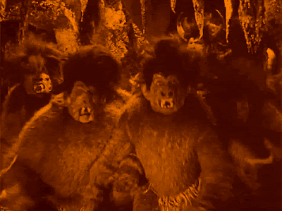 Unsurprisingly, the Bogeymen left a deep impression on my imagination, so deep that, until I read Jesse Smith's comment on yesterday's post, I hadn't realized the extent to which my conception of D&D's various monstrous humanoids owed to them. The Bogeymen are vicious, bestial things who obviously hate goodness and delight in chaos. Later in the movie, Silas Barnaby rallies them to his side. He leads a horde of Bogeymen in an assault on Toyland, where they wreak havoc upon its buildings and inhabitants.
