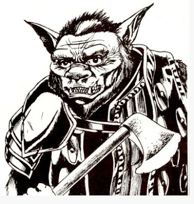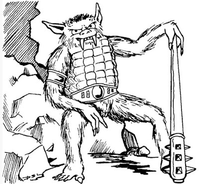 Of course, that one exception is a big one. More than that, it's the original illustration of the bugbear, as drawn by Greg Bell in OD&D's Supplement I (1975). Look upon his majesty!