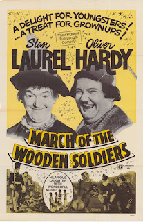 The actual plot of March of the Wooden Soldiers isn't particularly important. It's a comedic fairytale film set in Toyland, with Laurel and Hardy playing two friends, Stannie Dum and Ollie Dee, who work for the Toymaker, who, in turn, supplies toys for Santa Claus. Also living in Toyland is Silas Barnaby, the Crooked Man, who is also the town's richest inhabitant. By duplicitous means, Barnaby frames Tom-Tom the Piper's Son for the kidnapping and probable murder of one of the Three Little Pigs, resulting in his banishment to Bogeyland.