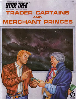 So, when FASA released the Trader Captains and Merchant Princes supplement in 1982, I immediately snapped it up. I've mentioned my love for it previously, but, until now, I've not had the chance to talk about it in any detail. Where Star Trek the Role Playing Game was (obviously) devoted to Starfleet characters and their exploration of the galaxy, this 52-page book focused on civilian characters, specifically "traders, privateers, merchants, con-men, and rouges [sic]," as its back cover boasted. If you're the sort of person who ever watched "The Trouble with Tribbles" and wondered what other shenanigans Cyrano Jones might have gotten up to or imagined what life was like for Harcourt Fenton Mudd as he perpetrated his illicit schemes at the far corners of space. this is the supplement for you.