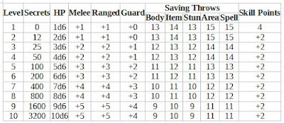 Prime Abilities: DEX and INTHit Points: 1d6 per level Starting Possessions: Leather breastplate, dagger, one-handed weapon, tool bag, 3d6 × 5ul